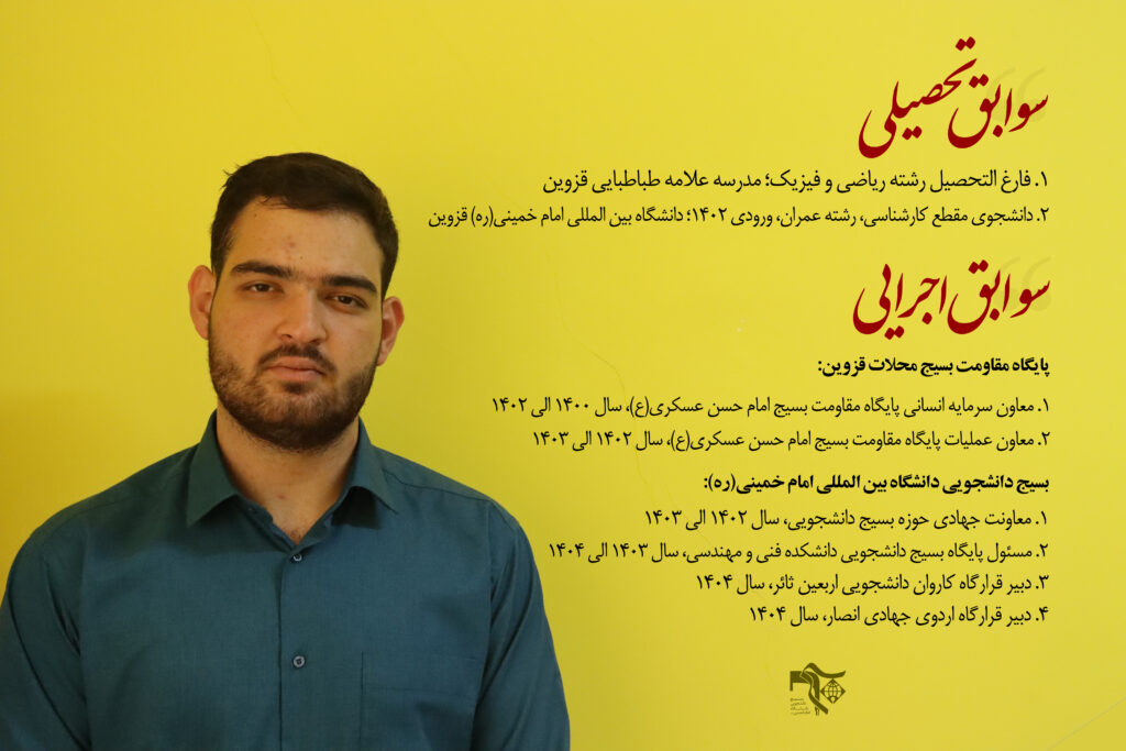 📌 محمدمهدی اسفندیاری دانشجوی مقطع کارشناسی رشته عمران است که پیش از این مسئولیت پایگاه بسیج دانشجویی دانشکده فنی و مهندسی دانشگاه را برعهده داشت‌.